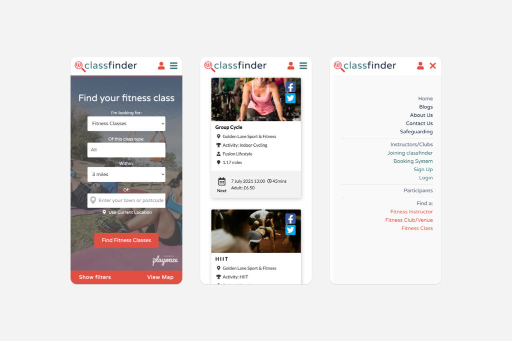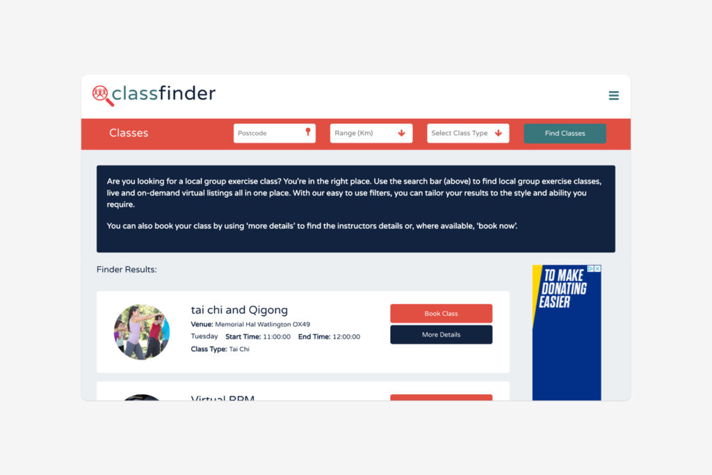 Responsive website for Classfinder, the largest directory of group exercise classes in the UK. This build utilises a Playwaze finder to connect users to activities and a Find an Instructor, Class, Venue search which populates dynamically through IMIN data feeds. Classfinder can also capture searches for activities made by users in Google Search and create a specific filtered result on the Classfinder website linked through directly from a Google Search Result.
